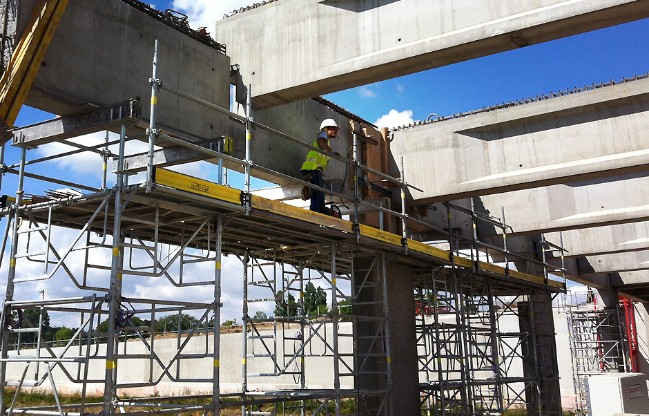 To reinforce the shells, Mills has rented out 60 Mills Acram MDS 6 m high reinforcement scaffolds fitted with safety rail and lifting rings for crane displacement. The scaffolds are stablised by push-pull props and concrete ballast.